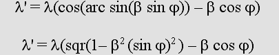 The important point is that the wavelength here is an artificial one because waves actually propagate from their origin, not from the emitter's new position. Surprisingly, the received frequency is the absolute one: f '' = f whatever the angle. However, the observer should be aware that this happens because he is moving along with the emitter. The sound waves are truly undergoing the Doppler effect, but he cannot detect the frequency change any more because the virtual one cancels the regular one. Let us suppose that beta is .5 and that the observer is placed in front of the emitter. Firstly, the forward true frequency is f ' = f / (1 – beta) = 2 times higher. But the observer is moving away from the place where the sound waves were emitted. So, according to the virtual Doppler effect, he records this truly higher frequency according to f '' = f ' (1 – beta) = .5 time lower. The recorded frequency finally remains unchanged. The equation for this is: f '' = f (1 – beta cos phi) / (1 – beta cos phi), hence f '' = f. This was discovered by Christian Doppler himself in 1842.