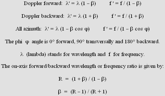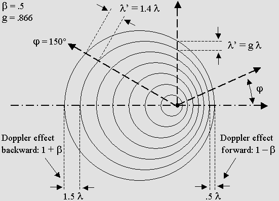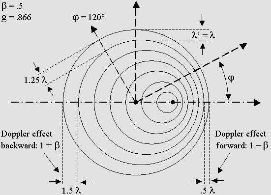 Let us take an example for beta = .5 and see how the Doppler effect modifies the sound waves. 1. The forward wavelength is: 1 – beta = .5 times shorter. 2. The backward wavelength is: 1 + beta = 1.5 times longer. 3. The forward frequency is: 1 / (1 – beta) = 2 times higher. 4. The backward frequency is: 1 / (1 + beta) = .6667 times lower. 5. The wavelength for a phi = 120° angle is: 1 – beta * cos 120° = 1.25 times longer. 6. The frequency for a phi = 120° angle is: 1 / (1 – beta * cos 120°) = .8 times lower. 7. The frequency and the wavelength remain unchanged along a transverse unmoving axis. 9. The beta velocity can be deduced from the forward wavelength: beta = 1 – .5 = .5 10. The beta velocity can be deduced from the backward wavelength: beta = 1.5 – 1 = .5 11. The forward vs. backward wavelength or frequency ratio is: R = (1 + beta) / (1 – beta) = 3 12. The beta velocity can be deduced from this ratio: (3 – 1) / (3 + 1) = .5 13. Lorentz's contraction factor is of no interest here: g = sqr(1 – .5 ^ 2) = .866
