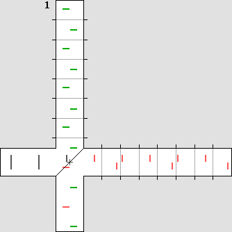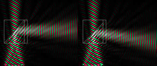 Only one half of the light beam emitted by the source is reflected by means of a beam splitter containing a 45° partially reflecting mirror. Then the beams are reflected on a flat mirror back to the beam splitter, which then reunifies them. Finally, both beams could be compared in a special scope. Michelson was expecting a phase shift. Waves would add themselves constructively or destructively, showing a characteristic interference pattern. The goal was to measure the fringes displacement after a 90° rotation. Such a rotation could be performed easily without any stress because the instrument was mounted on a large stone floating on a mercury pond. The temperature was also severely controlled. The Michelson interferometer animated diagrams. The animations below show what is going on inside the interferometer branches. I had to use a very high speed in order to obtain a clearly visible phase shift: one third of the speed of light. Then beta = .3333 and g = .9428. Such a speed produces a 2 : 1 wavelength ratio R along the displacement axis, according to: R = (1 + beta) / (1 – beta) This ratio indicates that on-axis planes crossing the starting point each minute, one at a time, would be two times nearer while flying against the wind. So one can imagine that each small red or green line shown below represents a plane. The aether wind blows from the right. The diagram on the left displays exactly the same length for both branches. This distance was calculated to obtain a full lambda / 2 phase shift. The wave fronts (or planes) along the motion axis are pictured in red and they are green crosswise. Michelson was expecting the phase shift shown on the left: |