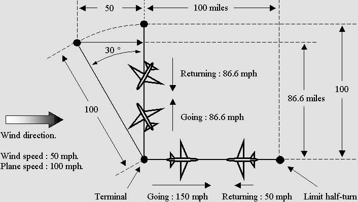 In 1887, Albert A. Michelson tried to detect the speed of the Earth through the aether by means of an interferometer. But his apparatus revealed nothing. It was a "failure". Actually, this experiment led to a fantastic scientific discovery: the Lorentz transformations and the theory of Relativity. A race between two planes. Michelson explained to his children that his interferometer reproduces a race on a river between two swimmers. In 1887 planes did not exist. Otherwise, he would certainly have spoken about a plane race while a strong wind is blowing. Let us consider two identical airplanes whose constant speed is 100 mph and suppose that the wind is blowing at 50 mph. Then the beta normalized speed is given by v / c = 50 / 100 = .5. According to the rules, both pilots must perform a round trip between two points 100 miles apart. The first pilot prefers to fly in the direction of the wind. But the second one chooses the transverse route and surprisingly, he easily wins the race. The point is that those planes behave exactly like the light waves. It is all about the Doppler effect. Their speed may be compared to the speed of light, and one may consider that there is an aether wind because the emitter is moving. |