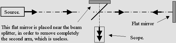 The animated diagrams shown above indicate that for one third of the speed of light, the interferometer arm length must be about 4 wavelengths in order to obtain the phase opposition. This length must be greater for smaller speeds. So Michelson had to build a very large interferometer. Michelson's calculus was rather complex because he considered the relative speed of light. One can more easily obtain the same length using the standing wave compression method. Theoretically, the calculus must take the slower frequency into account. So, in the absence of contraction, the formula for obtaining two beams in phase opposition using the computer should be: According to the absolute wavelength at rest: L = lambda / 4 g (1 – g) However, Michelson was unaware of the Lorentz transformations, hence the slower frequency. But surprisingly, his measurements for the yellow light wavelength would remain unchanged at any speed. Because the frequency does change, the formula above simplifies to: L = lambda / 4 ( 1 – g ) Example. Let us suppose a g = .9 contraction. Then beta = .4359 and 1 – g = .1. The formula yields 2.5 wavelengths, or 5 half-wavelengths. The plane mirror produces standing waves and the distance between two nodes is one half of a wavelength. The goal is to make a node coincide with the nearest antinode. One may add that, from Michelson's point of view, moving the mirror only a quarter of a wavelength produces a full phase opposition because of the go and return trip. So only a quarter of a wavelength difference is needed: