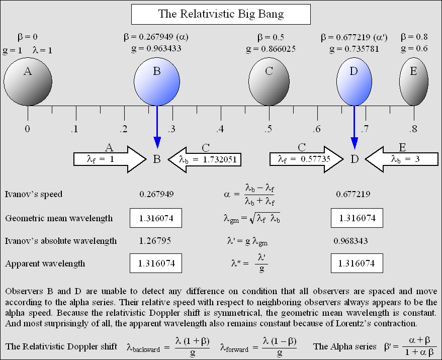 The Alpha suite. Most of the time, the Doppler effect is the cause of the forward vs. rearward wavelength difference. Christian Doppler himself pointed out in 1842 that this difference is unnoticeable if the observer is moving along with the transmitter. In this case, Ivanov's waves are moving at the same speed. The video below shows that this fundamental result is consistent with both the acoustic and relativistic Doppler effect. However, in the case of the relativistic Doppler effect, the slower frequency must be taken into account, and the result of this is that the Doppler effect seems to be relative. It is no longer possible to deduce one's absolute speed from it because of the amazing symmetry. This may easily be demonstrated using an "Alpha Suite", that is, any suite based on a constant alpha reference speed. The suite must be calculated according to Poincare's law of speed addition: beta = (alpha + alpha) / (1 + alpha * alpha) beta' = (alpha + beta) / (1 + alpha * beta) beta'' = (alpha + beta') / (1 + alpha * beta') For example, let's suppose that observer A below is stationary and that observer C is moving at beta = 0.5 times the speed of light. According to Poincare, the observer B must move at an intermediate alpha speed in order to see both A and C moving away from him at the same alpha speed. The alpha speed is given by: