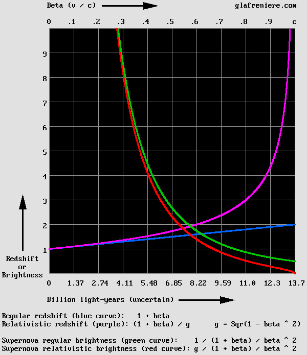 The Universe is likely to be expanding regularly. It was shown above that any expansion phenomenon must be relativistic. It is not possible to measure some consistent data in the presence of three A, B, C space ships regularly spaced without respecting the alpha speed of the central one. For example, speeds such as 0.0000001 c for A, 0.0000002 c for B and 0.0000003 c for C would definitely lead to an asymmetry because their initial equal distance will soon become unequal and measurable as such by both A and C. In short, the relativistic expansion is verifiable and measurable. What's more, it is consistent with Relativity. Thus, I am of an opinion that rejecting the relativistic hypothesis is highly imprudent, if not illogic. That is why Mr. Saul Perlmutter cannot deduce from his discovery that the Universe is expanding in an accelerated manner. It was even more imprudent to put forward the "dark energy" hypothesis in order to explain it. I do recognize the importance of his discovery, but it must definitely be interpreted as a confirmation that the expansion of the Universe is relativistic. The curves below are correct on condition that the Hubble constant is really constant, which is still to be demonstrated. So, let's suppose it is constant. In addition, one must realize that, if the expansion of the Universe is relativistic, the speed of light is unattainable. This is why the purple curve strongly deviates from the blue one when it approaches c. But surprisingly, although the well-known regular brightness (green curve) of a supernova differs if it is relativistic (red curve), the difference is rather small.