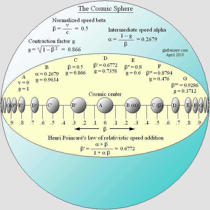 At first glance, this phenomenon might not look that important. However, it can be shown that it is closely related to the Lorentz Transformations. The node and antinode structure is moving at the "alpha" speed in the direction of the shorter waves so that its intrinsic energy is also moving at the alpha speed. Especially, as it was explained above, this system exhibits a slower pulsation rate and a longitudinal contraction with respect to the wavelength geometrical mean. What's more, because of the presence of a stunning phase wave, a series of clocks regulated according to the local phase would obviously display Lorentz's "local time". Such effects are indeed identical to those of the Lorentz Transformations. The Lorentz Transformations apply to all galaxies in the Universe. The point is that today's astronomers do not believe that remote galaxies are undergoing the Lorentz transformations. In their picture, because the Universe is expanding, galaxies are practically stationary with respect to the local "space fabric". This is known as the "raisin pudding model". Thus, even though we are surely not in the center of the Universe, we are still observing that all galaxies around us are receding according to Hubble's law. This interpretation of the Big Bang is incorrect, though, because Relativity always holds true. It does not tolerate any exception. Astronomers are aware that today's instruments and methods are amazingly accurate, so that relativistic speeds are no longer necessary in order to verify it. Especially, the speed of a moving space ship as measured from another one is verifiable using a Doppler radar. Hence, they must realize that some new crucial experiences are already possible. They should examine more carefully the Relativistic Big Bang hypothesis, simply because it will soon be verified. The expanding Universe is relativistic. That is, very distant and fast galaxies are undergoing the Lorentz transformations. They are emitting radio waves, light, X-rays and gamma rays according to a slower rate of time, and that is why the resulting Doppler effect is relativistic. Rearward relativistic Doppler: lambda' = lambda * (1 + beta) / g Relativistic redshift: R = (1 + beta) / g According to Relativity, even the most distant galaxies cannot reach the speed of light. Hence, a redshift of 2 or more cannot indicate that the speed of a galaxy is faster than the speed of light. For this reason, it is not acceptable to deal with a so-called "z" redshift, which is given by the wavelength ratio minus 1 in order to indicate the beta (or v / c) speed. Using the more acceptable redshift R shown above, the galaxy normalized speed is given by: beta = 2 / ((1 / R)^2 + 1) – 1 The most distant galaxies are also severely contracted according to the Lorentz-Fitzgerald contraction. This includes distances between them. As a result, the cosmic sphere seems to contain far more galaxies near its limits than in its central area. In the graphics below, seven galaxies (A to G) are placed and transformed according to the Lorentz transformations. This way, any of them may be considered to be stationary in the center of the universe, and the two neighboring galaxies seem to move away at the same distance and at the same alpha speed.