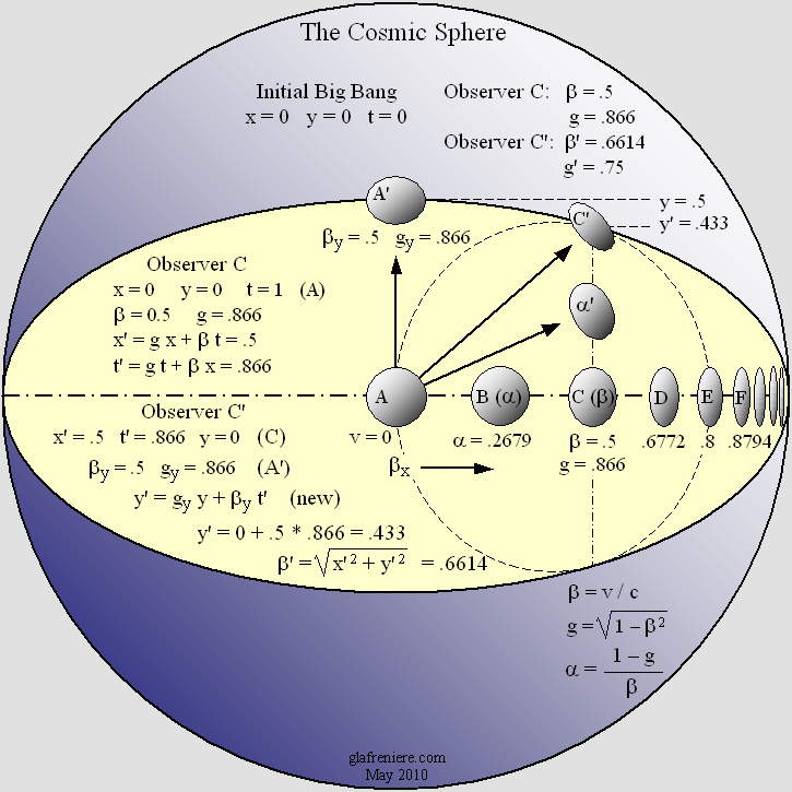 The Cosmic Sphere. In this example, the beta speed is 0.5 for C and the alpha intermediate speed is 0.2679 for B. As seen from the center A, the more the galaxies are distant and fast, the more they are contracted. But surprisingly, observer B also observes that he is stationary and that all galaxies are moving away from him. This happens because he is moving towards the waves incoming from the right. The result of this is that his perception of the time (his "local time") is distorted. The Time Scanner is capable of reproducing the equivalent distortion. Big_Bang_02_Doppler_Lorentz_Scan.avi The FreeBasic program: Big_Bang_02_Doppler_Lorentz_Scan.bas