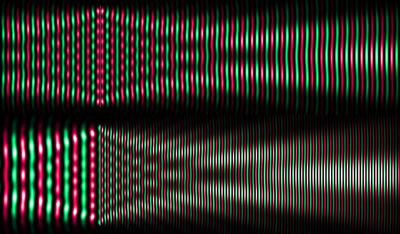 More recent experiences in favor of Lorentz's Relativity. The above diagram is a flawless demonstration that Lorentz's contraction really occurs for optical phenomena. In spite of the Doppler effect, the Fresnel-Fraunhofer diffraction pattern proves to remain perfectly symmetric in such a way that motion cannot be detected. Those results are possible thanks to Mr. Philippe Delmotte's and Jocelyn Marcotte's virtual medium, which is a powerful laboratory. The results are not disputable because they can also be reproduced using true physical devices and true waves such as the sound waves. They are much easier to obtain using the computer, though. The important point is that today's computers are amazingly fast and reliable. Especially, it becomes clear that Lorentz's Relativity, which is based on the existence of a preferred frame of reference (the aether) and on actual matter contraction, will replace Einstein's because it also explains matter mechanics. This will lead us well beyond a mere Relativity effect. The more our skill is improving, the more we are capable of making experiences. In addition, Lorentz's Relativity strongly suggests that matter is made of waves. The Wave Nature of Matter is on its way to be demonstrated. The Michelson Interferometer. More recently, we worked hard to obtain the best results from this virtual medium. A lot of annoying artifacts and anomalies were corrected. Now, our images are quite smooth and natural. Below are several new improved video clips showing how light travels in the Michelson Interferometer. There is a choice of two velocities. Firstly, half of the speed of light or 0.5 c, and secondly, 0.7 c. Transverse waves are tilted to an angle which is given by: arc sin (v/c), that is 30° and 45°. This behavior proves to be highly consistent with the Lorentz Transformations. The interferometer contraction leads to a modified angle for the beam splitter, whose normal angle is 45° when the apparatus is stationary. Surprisingly, the new angle works fine and apparently, all seems to happen as though the interferometer was still at rest. Judge by yourself.