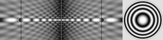 Please observe that the cross section pattern is identical to that of the diffractive lens. Such a lens is possible because of the Huygens Principle. Each concentric obstacle stops or diffracts any wavefront whose energy is opposite in phase with respect to the focal point. Thus, all remaining Huygens' wavelets are roughly in phase on a binary basis. The main difference is its hyperbolic shape especially on both ends. Fields of force act like a diffractive lens because waves cannot travel freely through antinodes, where the aether density is variable. This is an undisputable principle: waves need a medium whose density must be constant in order to propagate with a constant velocity. They do travel freely through nodes, where density is constant, but they are weakly but surely scattered by each antinode. Thus, the addition for so many of them is finally decisive. Clearly, the amplified field of force should act more or less like an emitter whose structure is that of the diffractive lens. There is a converging effect. A significant part of the energy is focused towards both electrons. From another point of view, the field acts like a "diffractive mirror" capable of returning back all waves incoming from two electrons simultaneously. This explains radiation pressure and also action and reaction. The phase rotation. However, it is not that simple because the whole concentric node and antinode structure is moving away from the center. This produces a phase rotation, which is very regular everywhere because variable radii for concentric areas are compensated by variable velocity. Obviously, such a field alone cannot focalize energy because it is constantly rotated in phase in such a way that outgoing waves only are amplified. But it is not the case if the pattern is periodically stopped much the same way a stroboscope can apparently immobilize any rotating unit such as a wheel or a fan. The stroboscope effect. The electron acts like a perfect stroboscope because all its node and antinode structure oscillates simultaneously. The electron is a finite standing wave system, but its partially standing wave area nevertheless expands through billions of wavelengths. Its influence inside the field of force is determinant. So, when two electrons come rather close together, the wave addition clearly produces a stroboscopic effect on the field of force, at least in their respective area. Theoretically, three traveling wave trains are involved. If phases do not coincide, nodes and antinodes are weakened. They are rather strengthened when all three phases coincide. The important point is that this process is simultaneous. The electron spin does not matter either because nodes and antinodes appear simultaneously for both spins, while they appear with a pi / 2 phase offset for positrons whatever their spin. In all cases, this partially cancels the phase rotation inside the field of force. Finally, the amplification process produces Huygens wavelets which are mostly in phase with respect to electron or positron pairs, but the phase is opposite for an electron in the presence of a positron on a go and return trip. Then an attraction effect rather occurs as a result of stronger waves incoming from the opposite side. The electron synchronization. Additionally, in the presence of many electrons, the stroboscopic effect between each of them matches constantly because all electrons oscillate simultaneously. If the phase does not match exactly for a given electron, the whole oscillating structure will correct the anomaly. This synchronization phenomenon also influences the positron spin as long as it is not well secured inside a proton. It will slowly transform into an electron unless it previously reacts with the nearest electron and produce a quark. This occurs inside and around regular atomic structures because electrons are always nearer to each other. The nucleus may rather contain many positrons where the phase synchronization is compatible because the gluonic field conveniently produces a central area where the phase in quadrature allows it. The animated diagram below clearly shows this surprising phenomenon. The stroboscopic effect is also well visible. The diffractive lens structure is no longer regularly moving away from the center. It is rather moving by successive pulses separated by a pause. This happens because the electron partially standing waves (where outgoing waves are stronger) progressively transform into pure standing waves nearer to its center.