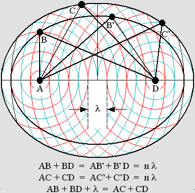 In order to work properly, the field of force must exhibit stunning properties. The goal is to justify radiation pressure, which is at the very basis of matter mechanics. The phase must obviously match for nodes and antinodes everywhere inside a huge 3-dimensional space. This suggests holography. The ellipsoid mirror is perfect for this. The diagram below especially shows that exchanges between two electrons via many theoretical concentric ellipsoid mirrors constantly match the wavelength because all distances are always integer multiples. All concentric (theoretical) mirrors have the same focal points A and D. Whatever their path, spherical waves emitted from A always reach D in accordance with the same phase. Actually, the node and antinode pattern is not a mirror but the amplification process produces a similar effect. Finally, all ellipsoid layers act like mirrors and spherical waves are perfectly focalized towards the opposite electron. |