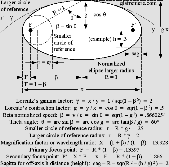 The ellipse is also the basis of the Lorentz transformations. Because the field of force is already ellipsoid, the Lorentz transformations simply modify its structure while it moves into a different one whose properties do not change. As far as I know, I am the first one to point out that the Lorentz transformations are just how the Doppler effect transforms matter, and that the ellipse is totally founded on its basic magnitudes. The diagram below shows that Lorentz's contraction factor g and the theta angle as compared to the normalized beta velocity are related to the ellipse. Poincaré's "aberration" according to g squared, which he used in order to explain Relativity, is the radius (r) of the smaller circle of reference. The gamma factor is that of the larger one. |
