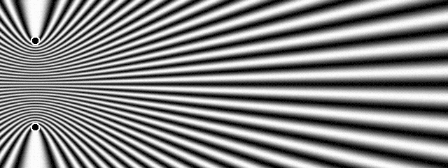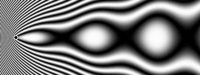 Transparency. Inside air, water, or glass, the light waves constantly disturb electrons which emit some new light whose phase is opposite. The original waves simply go through any object but their action is cancelled. The light seems to go through any transparent material, but one must realize that the exiting light is new. A substance is transparent because it has a perfectly homogeneous structure. For instance, a crystal is made of regularly spaced atoms. All electrons inside it will react to any incident light wave and produce a new wave according to Huygens' Principle. Because there are two sorts of electrons whose spin (phase) is opposite, one half is slightly pushed by the incident wave while the other half is rather attracted. All of them react like a genuine wave medium. The electronic wave is transmitted all the way towards the other surface, where surface electrons finally emit some new light. So there is no true light inside air, water or glass, albeit the electromagnetic effects are still present. The diagram below shows that only a 1/4 wavelength displacement along the axis nevertheless produces a stunning and powerful set of pulses: |