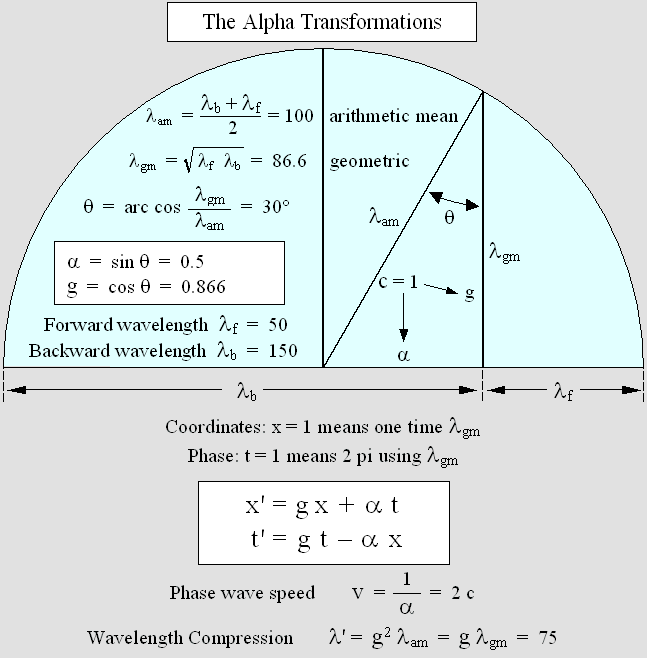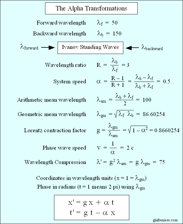 THE ALPHA TRANSFORMATIONS Ivanov's waves may be displayed on a computer screen using the Lorentz transformations. However, Lorentz's original set does not yield correct results because of multiple anomalies, including space and time incorrect interpretation. It appeared preferable to elaborate some specific transformations which apply solely to Ivanov's waves. I called them "Alpha Transformations" because they are marking the beginning of a great new science trek. Thanks to it, studying Relativity and Matter Mechanics will henceforth be much easier. The goal here is not to deal with space and time. Theoretically, Ivanov's waves are just the result of the addition of two wave trains propagating in opposite directions and whose wavelength differ. The only available variables are those two wavelengths. Thus, we are in the presence of a quite basic physical phenomenon which should definitely not require the use of non-Euclidean geometry... Firstly, the variables x and x' are to be given in wavelength units. They must be converted into pixels afterwards because the goal is to display Ivanov's waves on the computer screen. Secondly, the phase t must be given in wave period units, and then converted into radians. Although they are space and time units, they are definitely not to be given in meters and seconds. Surely, today's Relativity is a mess because the equivalent precalculus for the electron and for matter was not carefully explained by Lorentz, Larmor and Poincare. Fortunately, one must also get rid of Maxwell's equations because the Alpha Transformations also apply to acoustic waves, which are not "electromagnetic" in nature. The table below should be useful in order to deal with Ivanov's waves. The two wavelengths, forward and backward, are the only variables. It is shown that, in all cases, the x and t variables must be given according to the geometrical mean wavelength. As a matter of fact, in the case of the acoustic Doppler effect, the forward and backward wavelengths are shorter. Thus, x and t will refer to a shorter geometrical mean wavelength and the Alpha Transformations will finally reproduce the acoustic contraction.