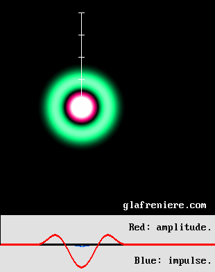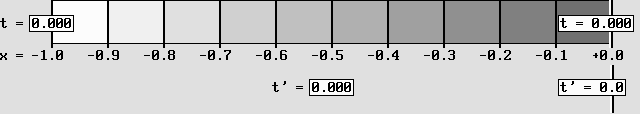The Time Scanner may contract the frame of reference by moving it according to the "alpha" speed (see below). In this case, the scan speed and the print speed are the same. However, the animated Gif shown above uses a slower print speed in order to achieve the same result. In this case, the frame of reference to be transformed does not move. The result is consistent with the Lorentz transformations. The x = –1 coordinate transforms to x' = –0,5 light-second according to Lorentz's contraction factor g. Whatever the delay, the clock in the front is late with respect to the other one at the rear. This "local time" is given by: –beta for every x = 1 light-second before contraction occurred. One should bear in mind that moving clocks also run slow compared to stationary ones. The scan speed is that of the phase wave. The phase wave was Louis de Broglie's discovery but is is a mere consequence of the Lorentz transformations. It follows coordinates in the line of motion where the t' time remains the same. The Time Scanner also follows those coordinates in order to finally obtain a full image where the t' time seems to be the same as seen by a moving observer. The phase wave velocity is always faster than the speed of light. It is given by: c ^ 2 / v meters per second or by: 1 / beta light-seconds per second (or wavelengths per wave cycle). It is well visible in the animation below showing the moving electron on the right: