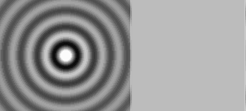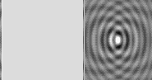 The static electron (left) and the moving electron (right). Please observe the vertical dark stripes regularly spaced which are moving to the right: this is the phase wave. Scanning the image on the right in-between the stripes at the same speed produces an image of the static electron. Reciprocally, scanning the image on the left at the same speed produces an image of the moving electron. Such a result is amazing. It explains Relativity.