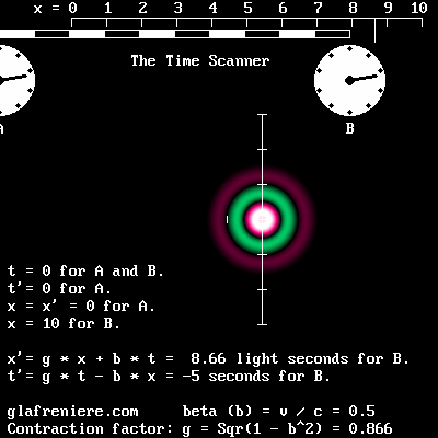 You may also examine the movie clip below, which shows plane waves, then curved waves producing interferences. The white cursor follows the resulting phase wave: Program: Phase_Wave.bas Phase_Wave.exe This is the most obvious effect of a scanner. If it scans an animated scene, the result is a still image where events did not occur at the same time. The Time Scanner really scans the time. In the animation at the beginning of this page, the Scanner transforms regular concentric waves into non concentric ones which are undergoing the Doppler effect. During the same process, the moving scale and clocks shrink according to Lorentz's factor g. And finally, the clocks indicate Lorentz's local time. The forward and backward wavelength is measurable thanks to the graduated scale. It is easily verifiable that instead of the regular 1 + beta and 1 – beta, the wavelength is modified according to (1 + beta) / g and (1 – beta) / g. The longer than expected wavelength is caused by the slower frequency. Perpendicularly to the line of motion, the normal wavelength contraction according to g is canceled for the same reason. This result is consistent with Lorentz's calculus: y' = y; z' = z and additionally, it indicates that events in this moving system occur at a slower rate of time. The scan speed. By trial and error, one easily comes to the conclusion that a given scan speed always produces the same Doppler effect whatever the frequency. The forward vs. backward wavelength ratio is given by: R = (1 + beta) / (1 – beta) For example, considering that beta is 0.866 (g = 0.5), the ratio is: R = 13.928. Let's say that V stands for the scan speed. It is a normalized speed (c = 1) so that it is given in light-seconds per second or in wavelengths per cycle. While the scanner is in front of the emitter, the waves are traveling towards it and their relative speed is V + 1. After having crossed the emitter, the scanner and the waves are moving in the same direction so that the relative speed is rather V – 1. Naturally, the goal is to obtain the same ratio R as mentioned above. One must respect the following equation; (V + 1) / (V – 1) = (1 + beta) / (1 – beta) Simplifying : V = 1 / beta The scan speed must be 1.1547 light-second in order to obtain the 13.928 forward vs. backward wavelength ratio. It should be emphasized that this speed coincides with that of the the famous "phase wave" discovered by Louis de Broglie (V = c ^ 2 / v). One may then search for the correct print speed which must produce Lorentz's local time according to –beta and Lorentz's contraction according to g. Any incorrect print speed is very easy to detect to a first approximation anyway because it produces elliptic waves. It will be shown below that the scan speed may preferably be the same as the print speed, which is given by: g / beta. In this case, the frame of reference to be transformed (according to beta) must be moved according to the intermediate speed: alpha = (1 – g) / beta. This motion cancels the effects of the slower scan speed. The print speed. If the frame of reference to be transformed remains immobile, the print speed "Vp" must be slower than the scan speed in order to produce a contraction according to Lorentz's factor g. Vp = g / beta If beta is 0.866, the print speed must be two times (1 / g = 2) slower than the scan speed, that is to say 0.57735 light-second per second instead of 1.1547. In practice, one must choose the print speed which produces spherical waves. This method leads to Lorentz's contraction factor g without the help of Lorentz. It should be remembered that standing waves contract. According to Michelson's calculus, the frequency does not change. In this case, standing waves contract according to Lorentz's factor g squared in the line of motion and they contract according to g (not squared) perpendicularly to the line of motion: