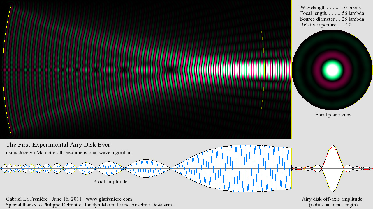 June 17, 2011. Below is a video of the Airy disk while it is progressively created out of incoming 3-D spherical waves. As I pointed out, this is the very first experimental demonstration of this most remarkable optical diffraction pattern. You may examine and compile the following program which created those images. The source code is in C. It stands in only one file and it is rather simple, so that it would be easier to analyze how Mr. Marcotte's 3-D wave algorithm works. |